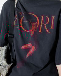 Limited-run, Synthia-817 1-color front graphic on black LA Apparel Oversized Short Sleeve High Mockneck T-shirt printed by The Dom Press.